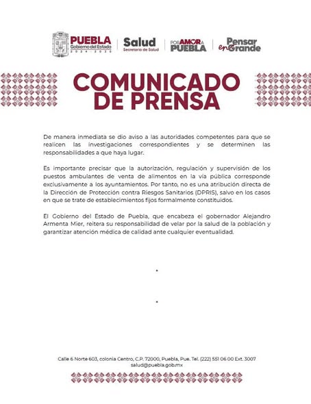 Comunicado sobre el caso de los menores intoxicados (Imagen de Secretaría de Salud de Puebla)